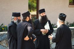 Some Serbian Orthodox monks with the bishop Porfirje of Jegar, igumen of the monastery of Kovilj (Novi Sad)