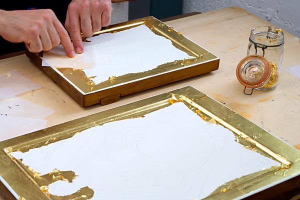 De l'or en feuilles à vingt-trois carats et trois quarts est appliqué dans les parties dorées de l'icône, qui sont protégées par une couche de laque.